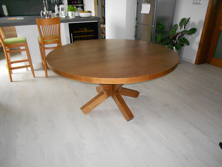 materiál - dub, barva - ořech, průměr - 161cm, síla desky - 5cm.